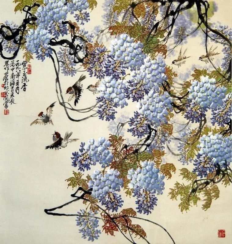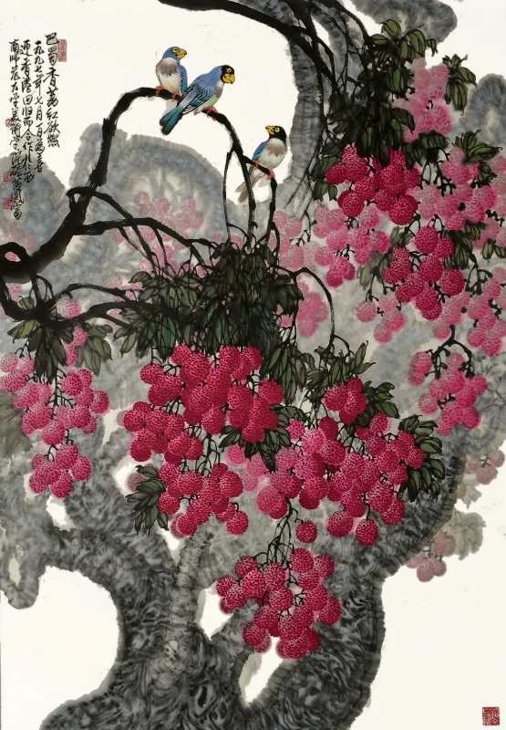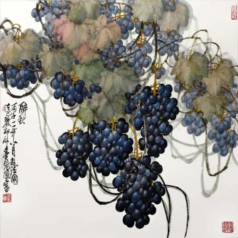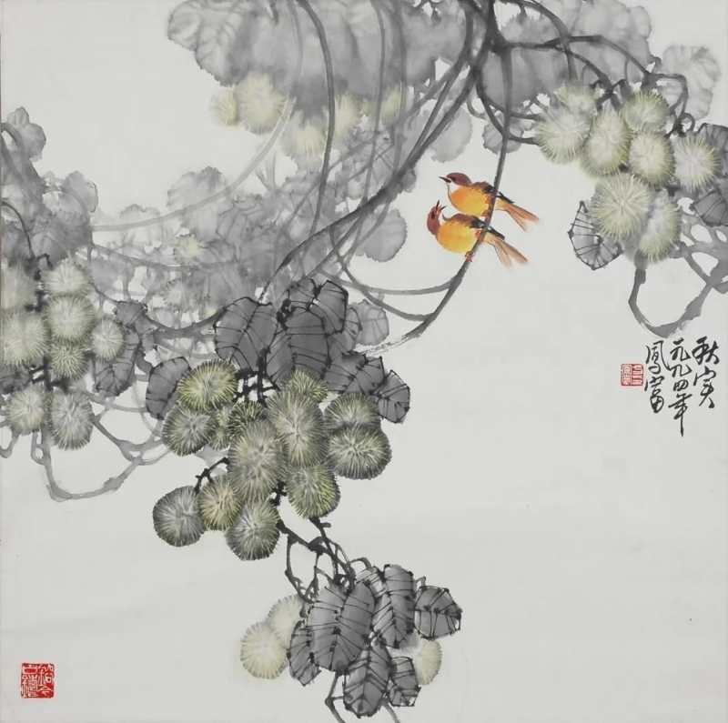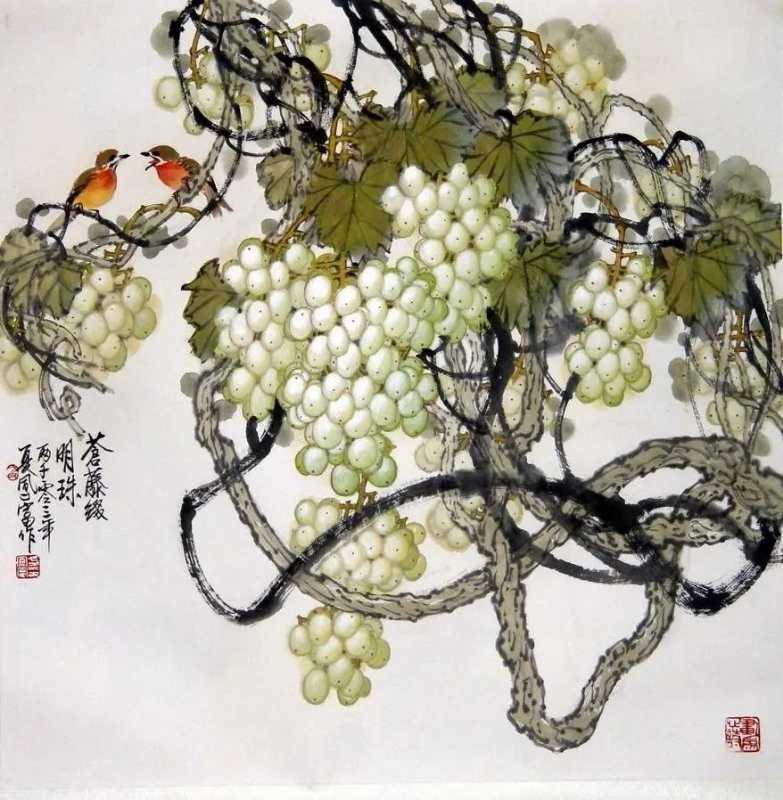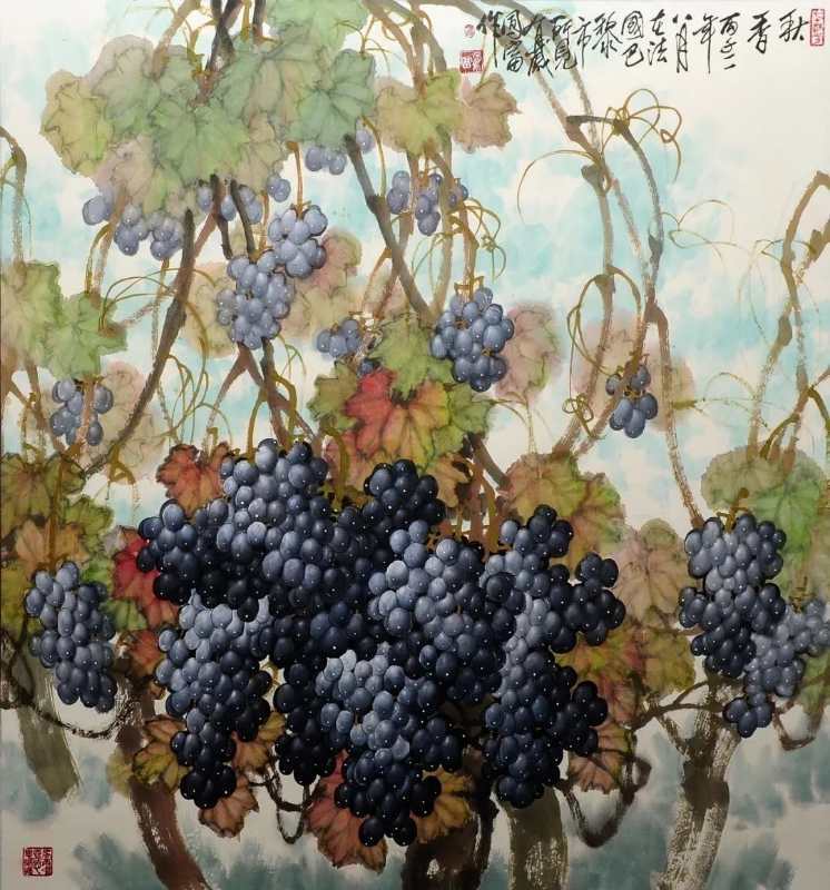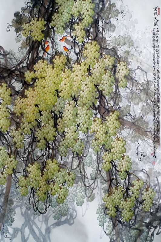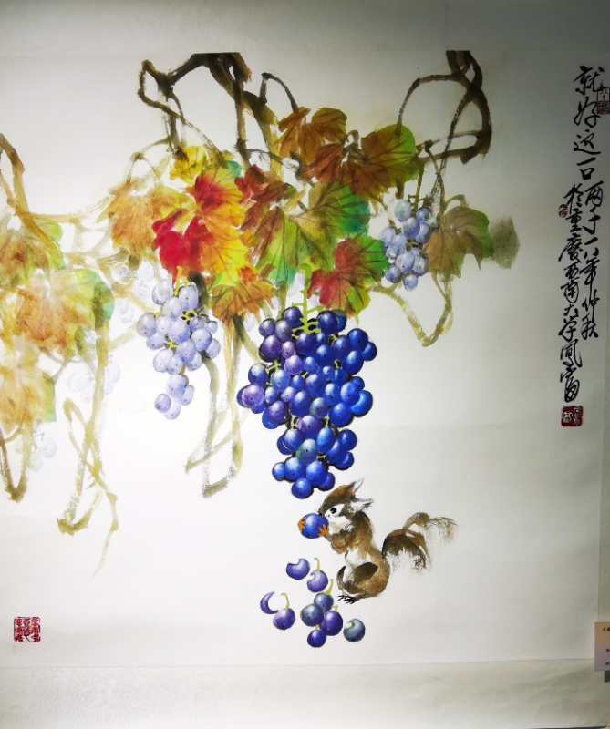 这幅画描绘的是一串串饱满的葡萄挂满枝头,几只黄色小鸟在藤蔓上“唱歌”的场景。整幅作品以青色为主,色彩淡雅。方凤富教授称,此次展出的作品中,《西域天赋》、《南国秋趣》等4幅作品均价值不菲。