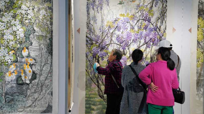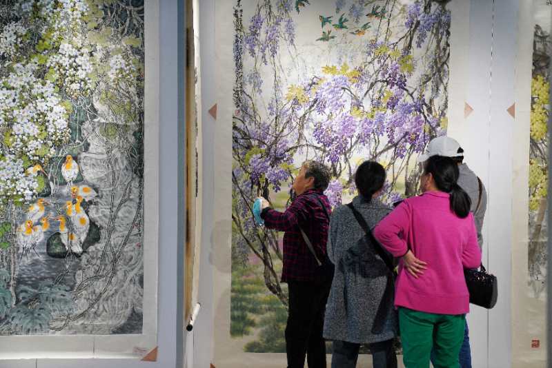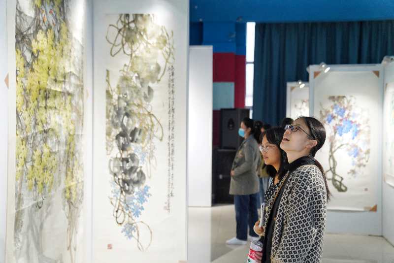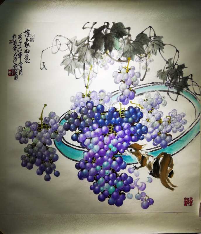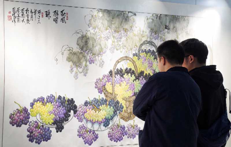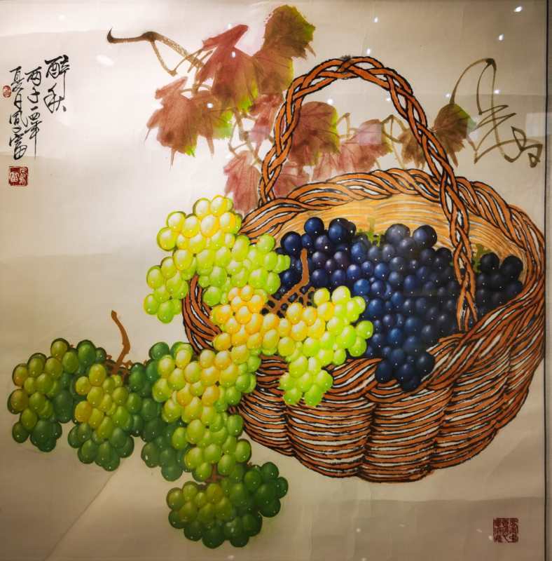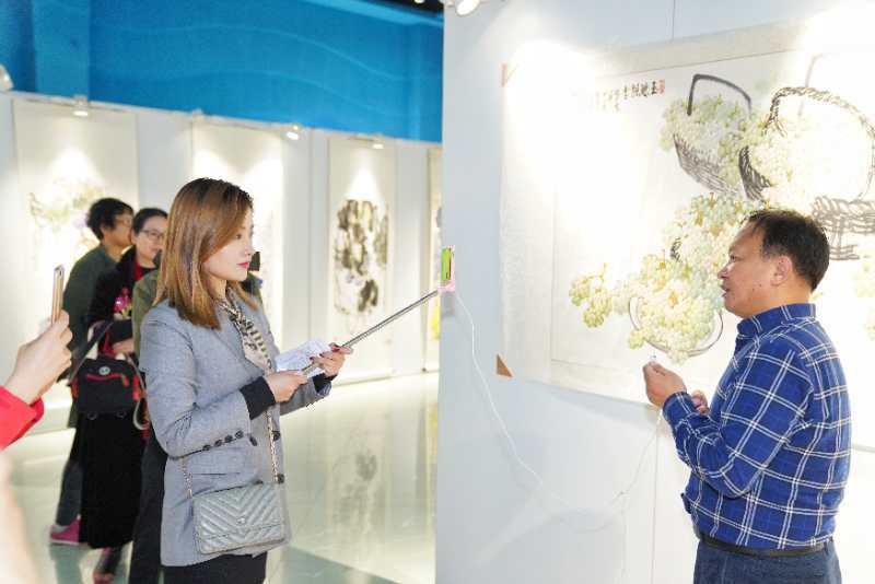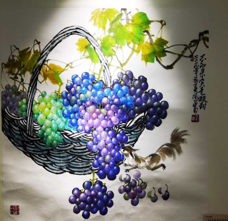 在画展现场,色彩斑斓的作品给观众带来了一场震撼的视觉盛宴,一幅幅葡萄、花鸟、山水画令人目不暇接,给人美的享受。