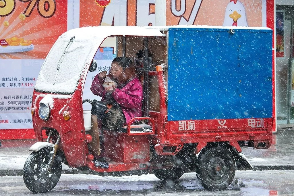 送快递的姑娘利用车棚挡雪,抽空在车上吃便当。张其辉 摄