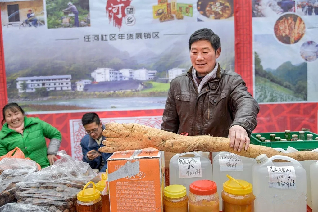 村民在路边摊位展示山货——脚板苕。张其辉 摄