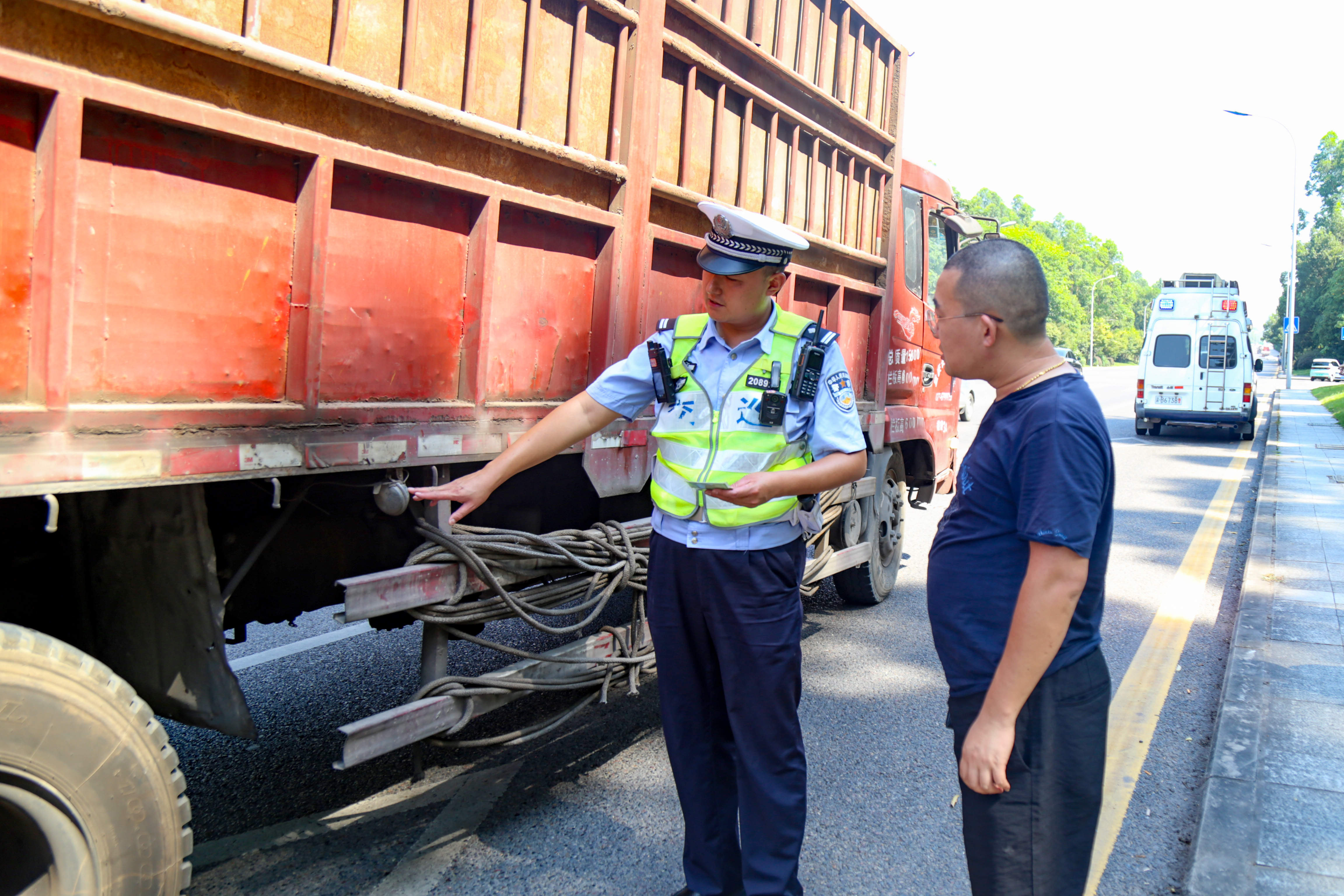8月4日,璧山璧青路上交巡警正在检查车主驾驶证和车辆装载物品。