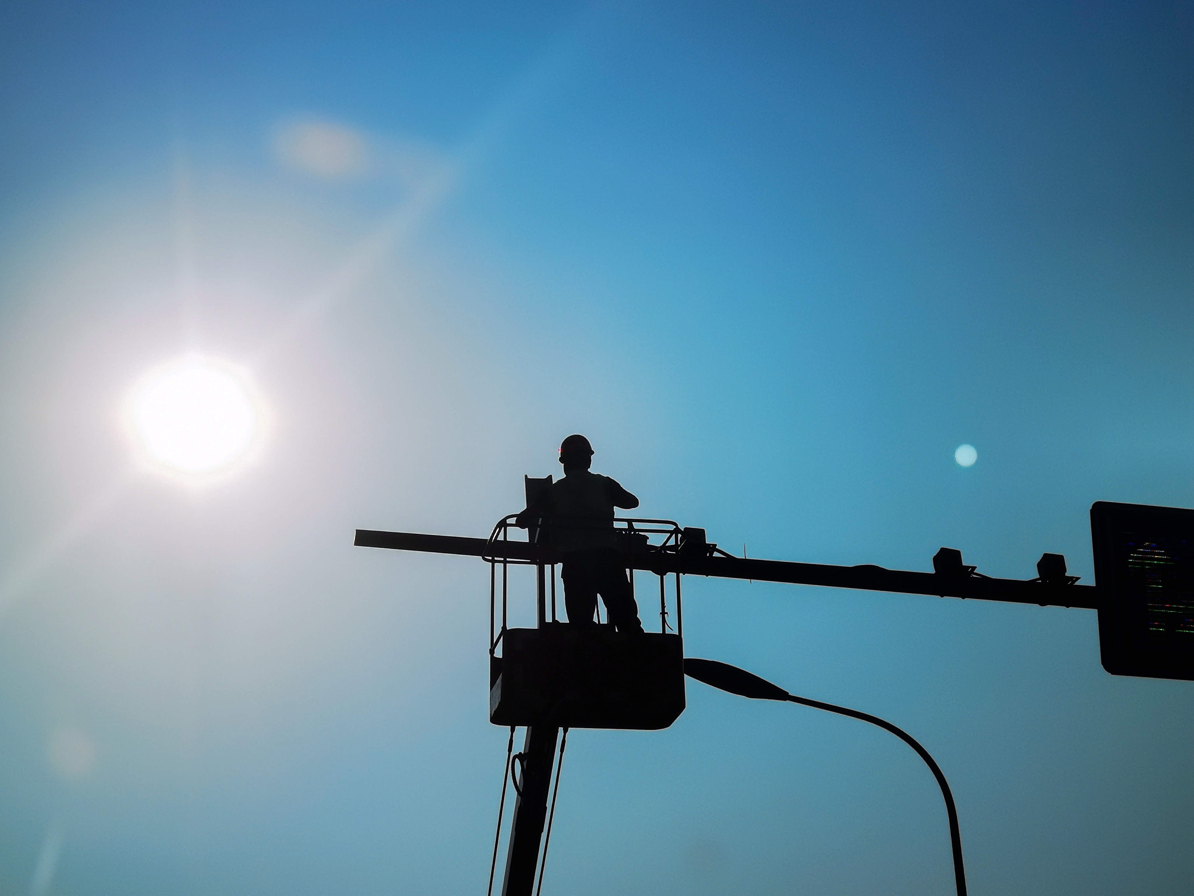 8月5日,璧山街头,工人顶着烈日检修监控设备。