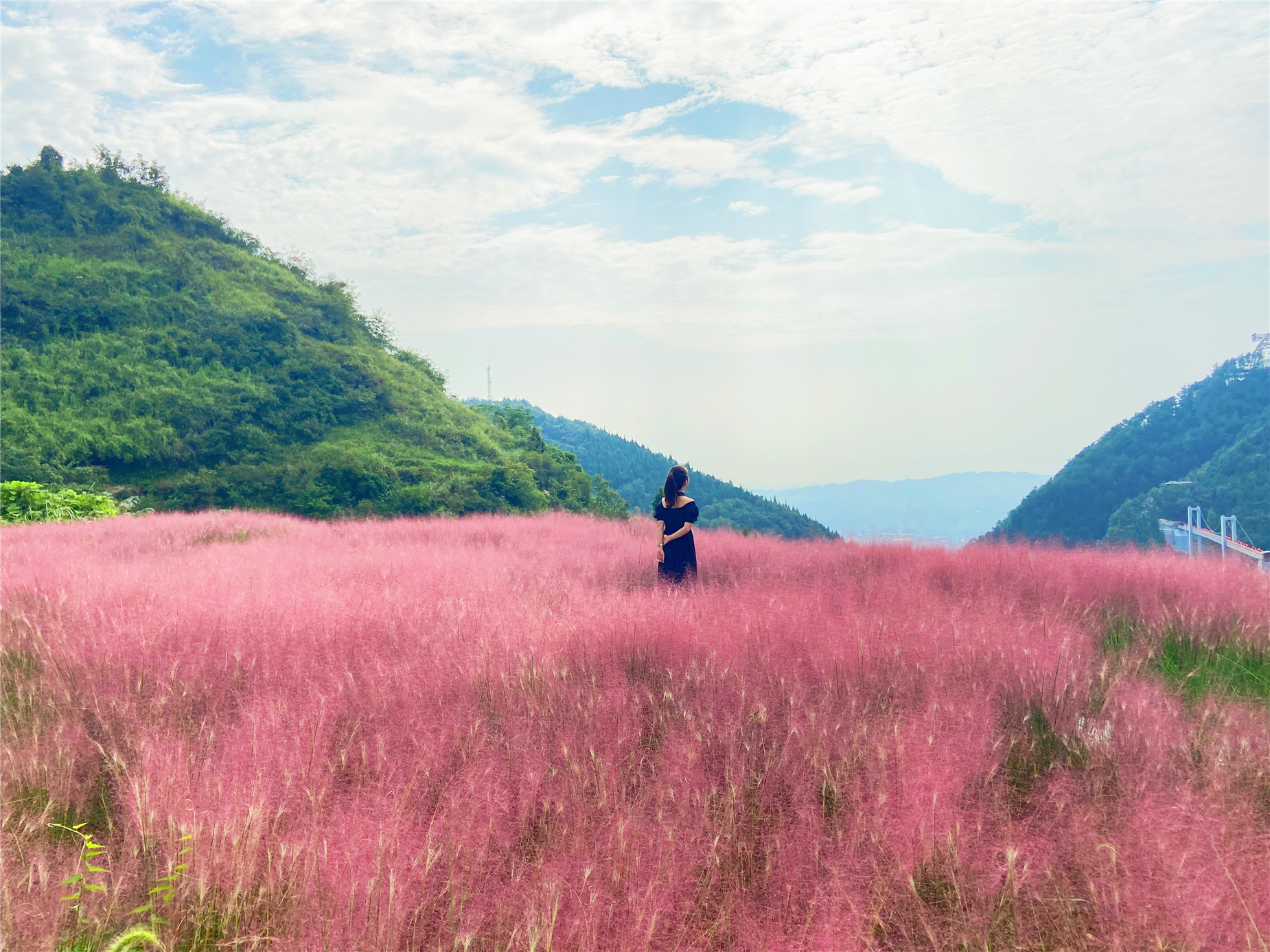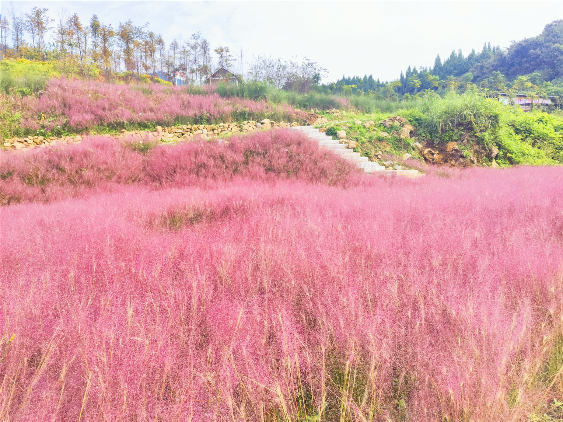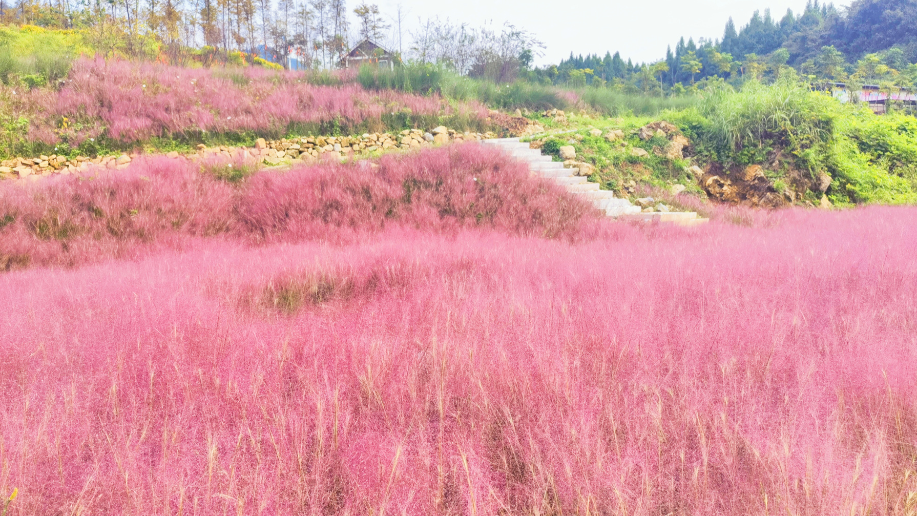 色彩绚烂的粉黛乱子草将大地渲染成了粉色的童话世界。记者 周小舟 摄