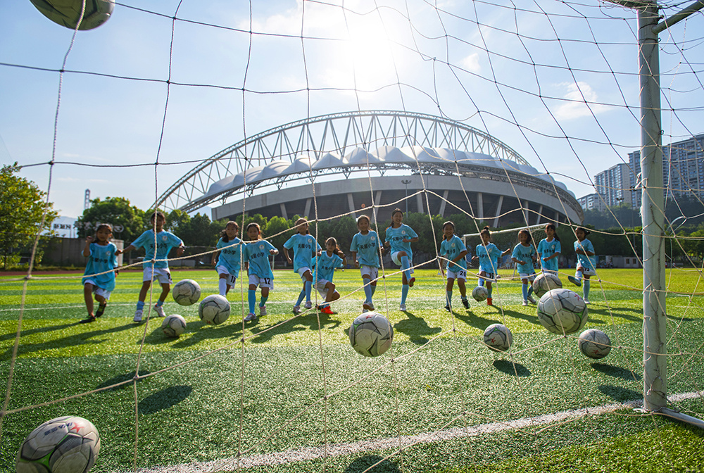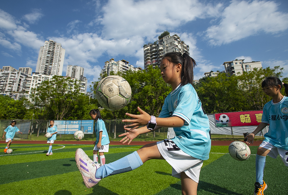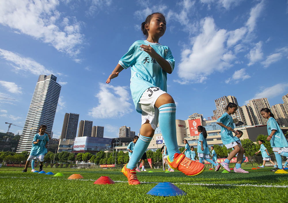 8月25日,万州城区持续高温天气。当日上午7点至9点,U8女子足球队正抓紧完成日常训练。近年来,万州足球蓬勃发展,目前已有500多名青少年儿童参加足球训练。图为训练身前小球门,逐梦身后大球场。冉孟军 摄