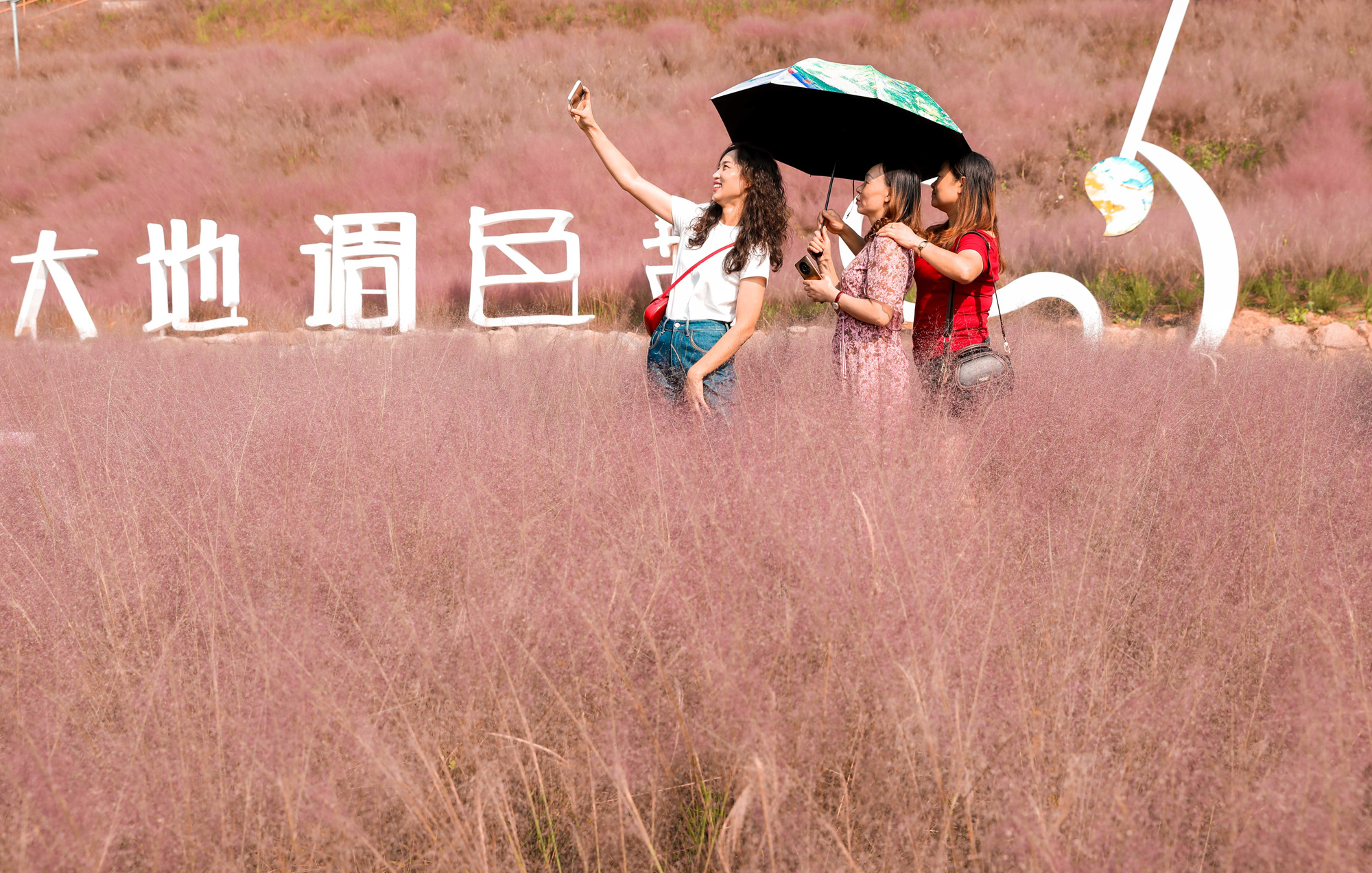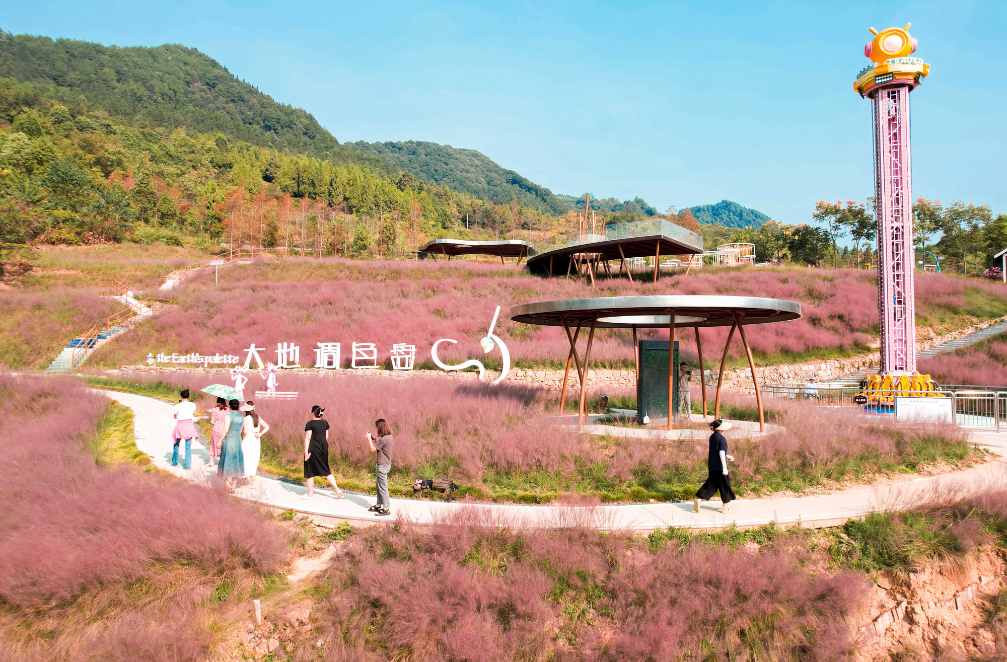 9月27日,世界旅游日,重庆市垫江县太平镇恺之峰旅游景区内,粉黛次第绽放,如粉色云雾般美不胜收,吸引众多游客前来观赏。记者 龚长浩 摄