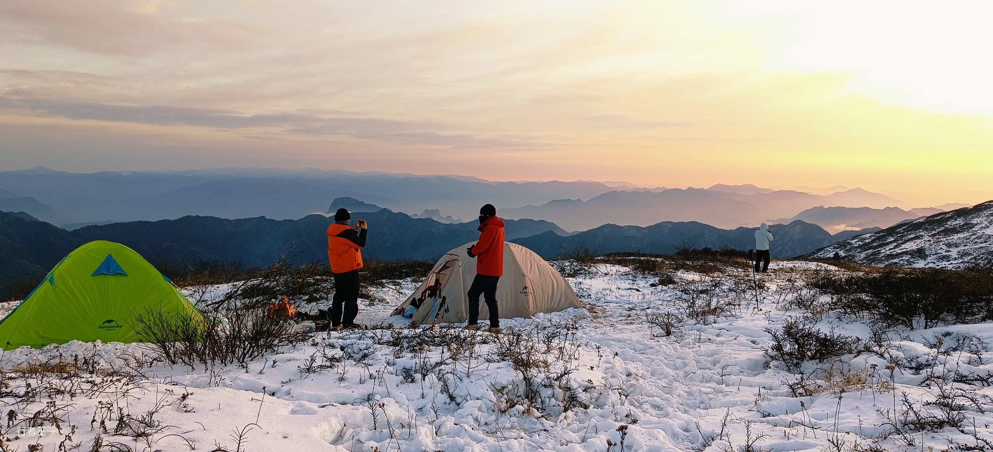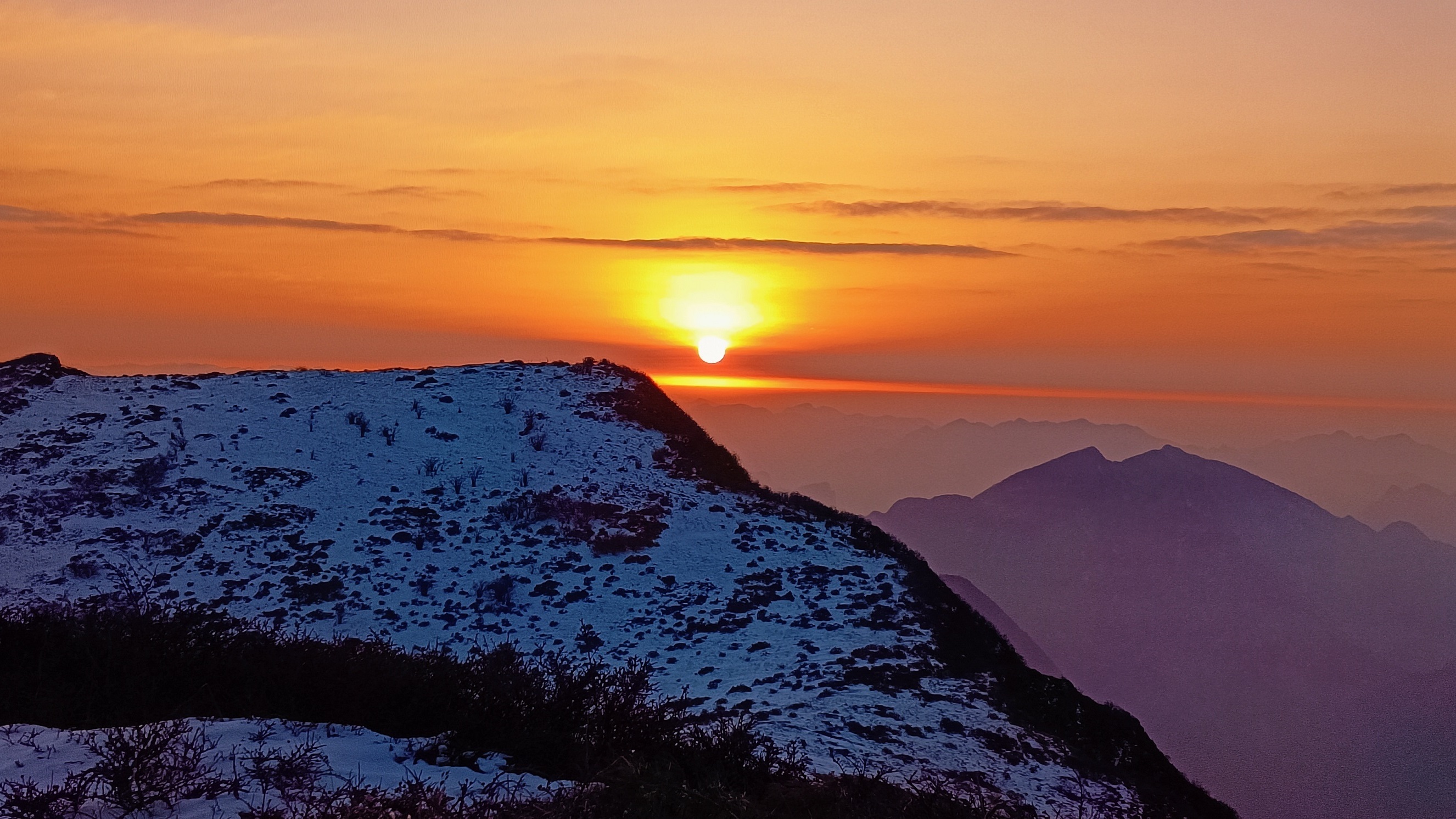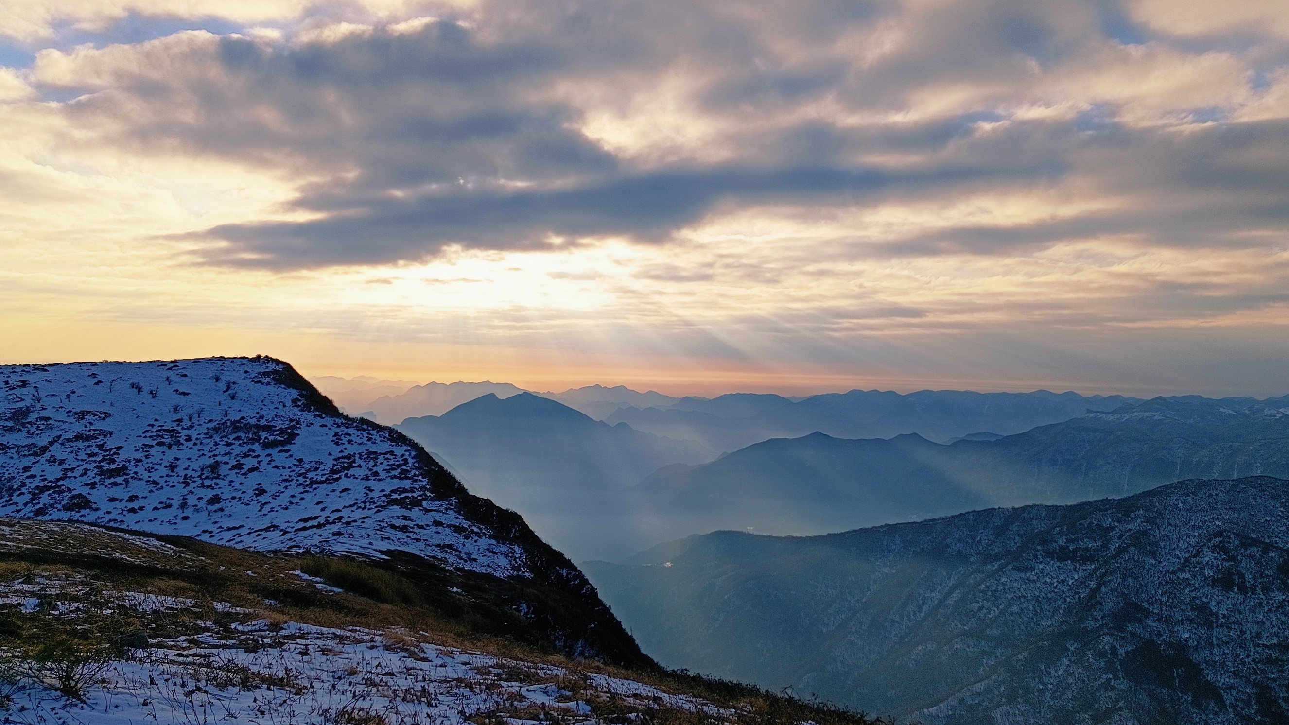 傍晚时分,阳光穿过云层,柔和的光线映着山上的积雪,整个场景美妙绝伦。图为重庆城口厚坪乡。(王超 摄)