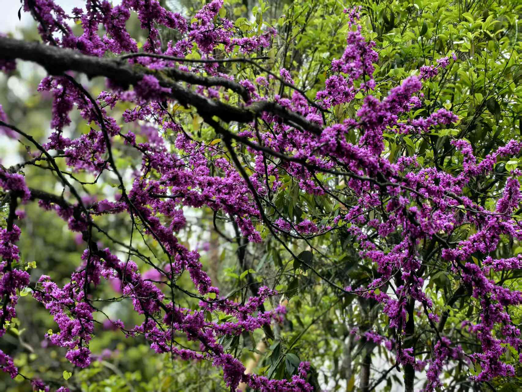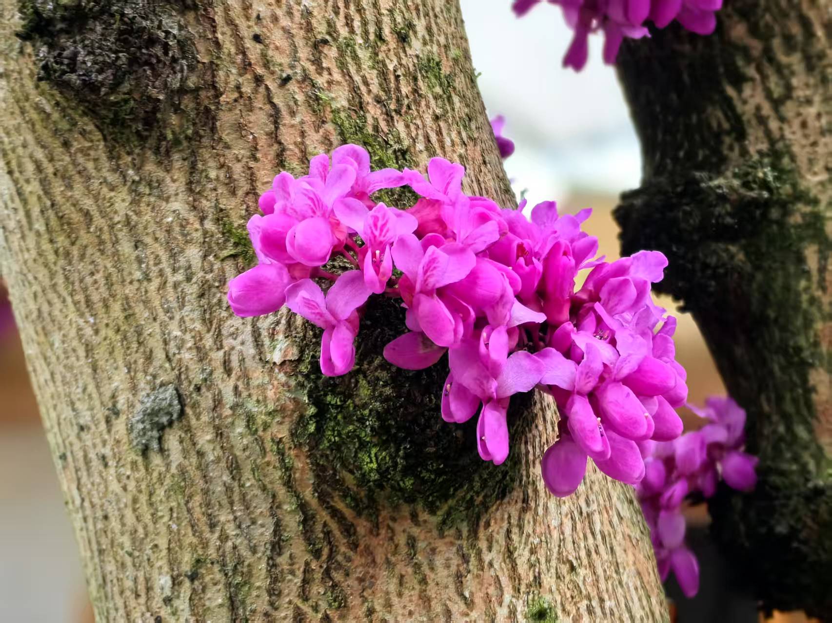 紫荆花花朵紫红色或粉红色,2-10朵簇生于老枝和主干上,先花后叶,花期3-4月。