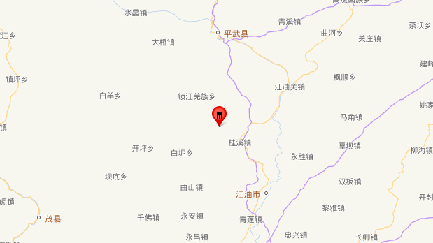 周边县城:震中距江油市34公里、距平武县41公里、距北川羌族自治县48公里、距安州区56公里、距游仙区66公里,距绵阳市65公里,距成都市161公里。