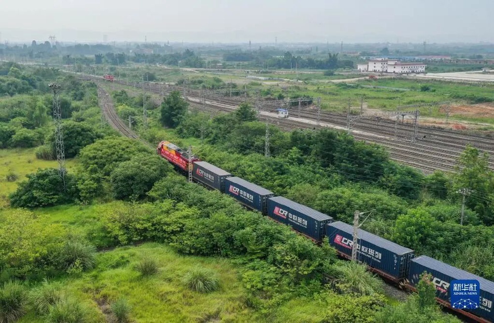▲中欧班列(成渝)列车从成都国际铁路港驶出(无人机照片)。记者 王曦 摄/新华社