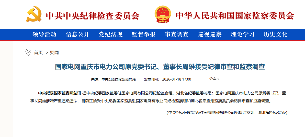 据中央纪委国家监委驻国家电网有限公司纪检监察组、湖北省纪委监委消息:国家电网重庆市电力公司原党委书记、董事长周雄涉嫌严重违纪违法,目前正接受中央纪委国家监委驻国家电网有限公司纪检监察组和湖北省恩施州监察委员会纪律审查和监察调查。