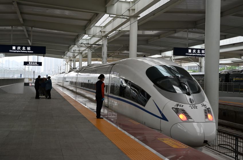 重庆火车站工作人员在站台上为旅客服务。重庆火车站供图