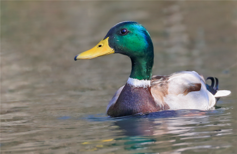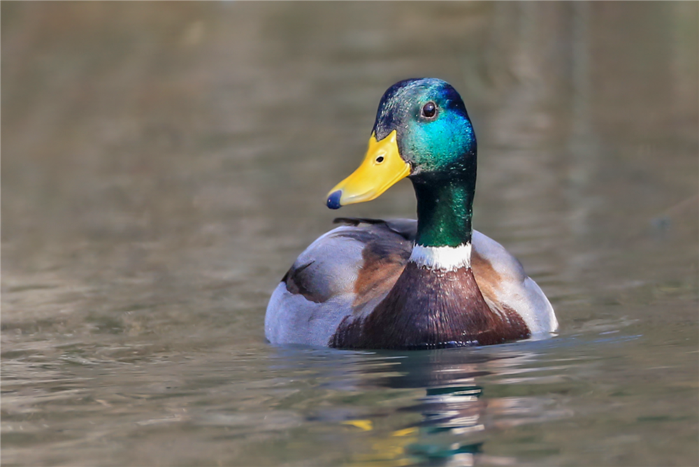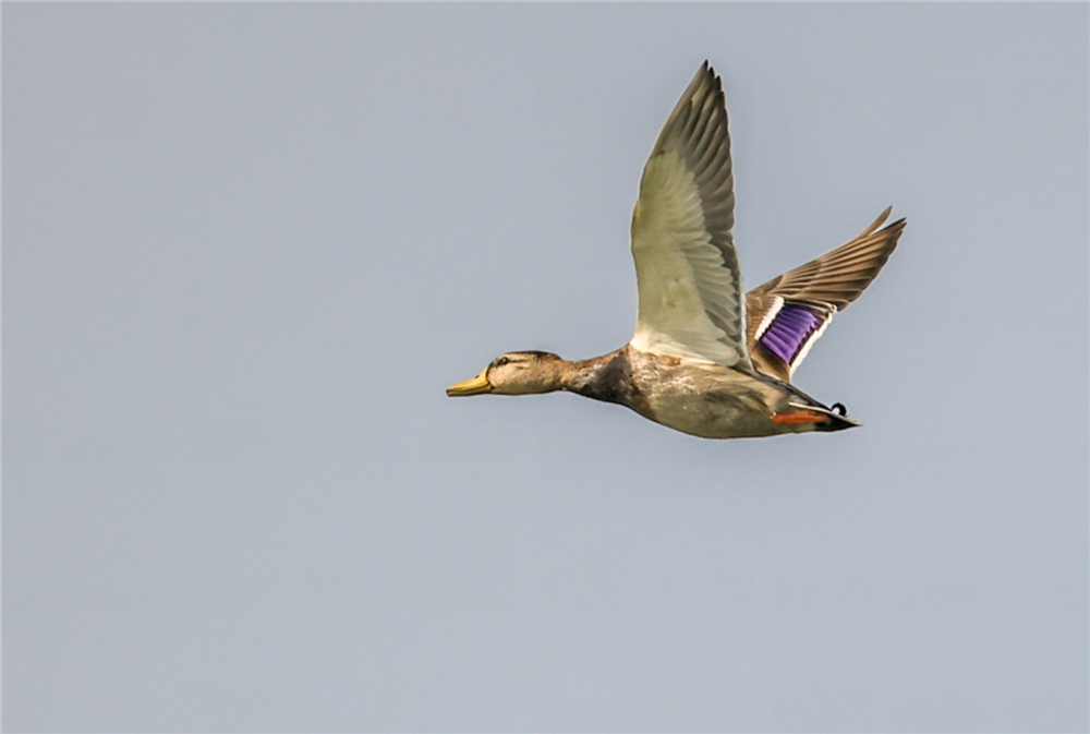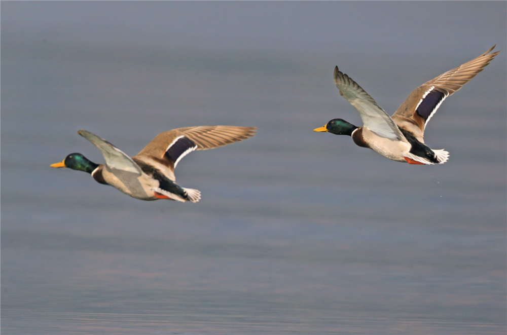 绿头鸭属游禽,大型鸭类。体长47-62厘米,体重大约1千克,外形大小和家鸭相似。雄鸟嘴黄绿色,脚橙黄色,头和颈辉绿色,颈部有一明显的白色领环。雌鸭嘴黑褐色,嘴端暗棕黄色,脚橙黄色和具有的紫蓝色翼镜及翼镜前后缘宽阔的白边等特征。图片拍摄于重庆市巫山县大昌湖国家湿地公园。摄影:陈光国