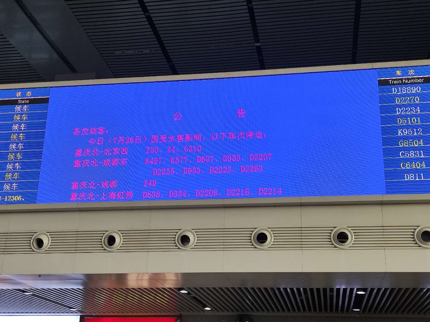 截至7月26日10点,重庆火车站停运列车汇总表