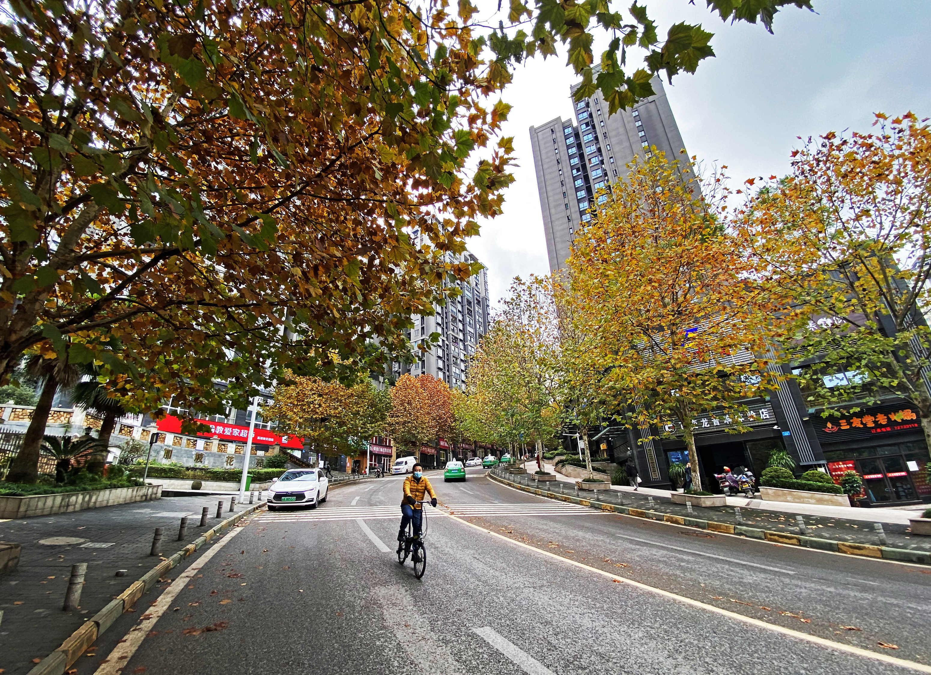 涪陵城区乌宝路两侧人行道上栽满法国梧桐树,一到秋冬季节,叶子变黄,随风吹过,一片片树叶落下,意境十足。黄河 摄