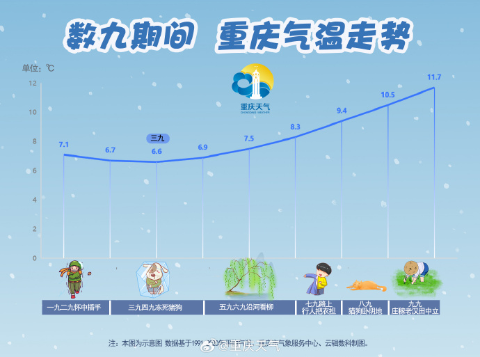 在数九寒天中,谁才是最冷的九天呢?重庆天气统计近30年数据发现,常年(1991-2020年)数九期间,一九到七九的全市平均气温持续在10℃以下,其中一九到三九期间气温一路下滑, 三九时达到平均气温最低值,四九之后气温走势开始出现转折,此后气温一路向上攀升。
